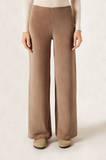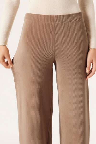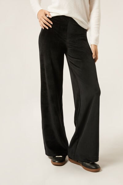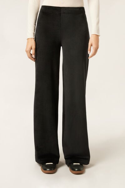 Ribbed velvet palazzo trousers, crafted from super-soft fabric for ultimate comfort. The soft elasticated waistband ensures a perfect fit, offering comfort and style.