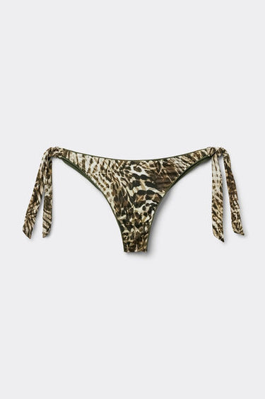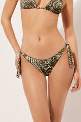 Brazilian bikini bottoms with bow fastening at the hips to adjust the fit. Thanks to the slightly rounded waist, they can be worn with a regular fit or with a higher leg to enhance your figure. A foliage pattern reminiscent of an animal print style combines exotic leaf motifs with the typical stripe patterns of the animal world. With a central seam at the back to ensure a better fit.