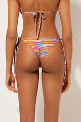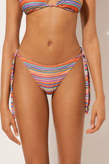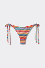 Brazilian bikini bottoms with tie fastening at the hips. Thanks to the slightly rounded waist, they can be worn with a regular fit or with a higher leg to enhance your figure. Refined white and blue geometric pattern, embellished with micro beads for a touch of elegant sophistication. Fully lined with invisible seams.