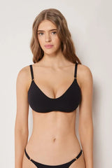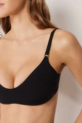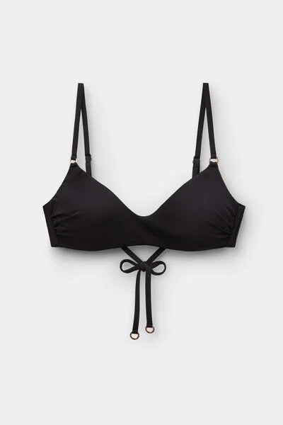 Non-wired low-cut brassiere bikini top with light padding for a natural effect. The super-soft fabric is pleasant to wear and light and comfortable on the skin. Adjustable shoulder straps and thin tie fastening complete the design.