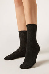 Women’s short socks with warm and thick cashmere offering comfort and a sparkly style. The rice grain pattern and glitter create a distinctive, sparkly design, ideal for cold days.