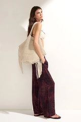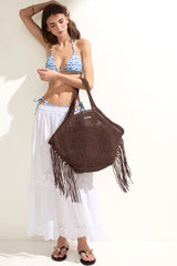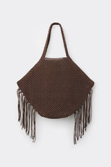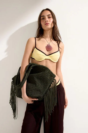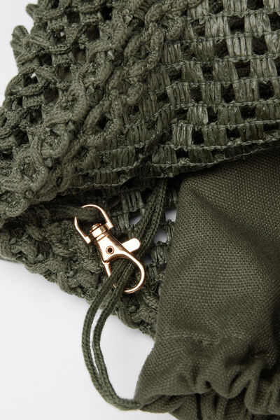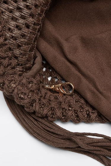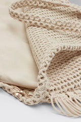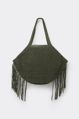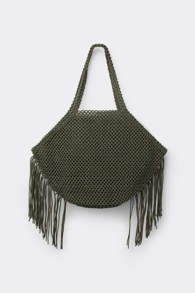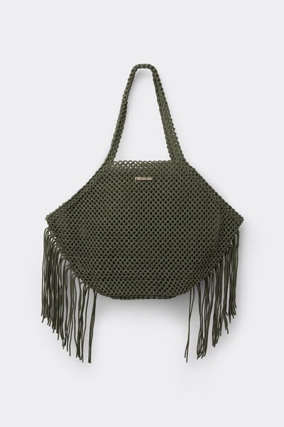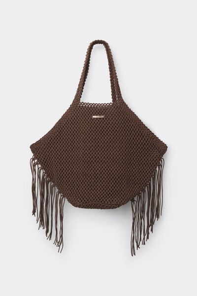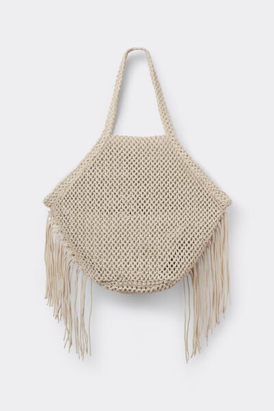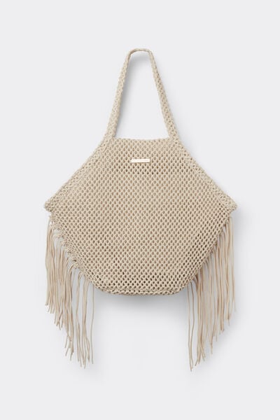 Beach bag with a handcrafted feel, featuring a design inspired by ethnic motifs, made in refined crochet knit, perfect for completing beach looks. The mesh workmanship, with its geometric pattern, is enhanced by long side fringing that adds movement and a boho-chic character. The interior features a removable drawstring pouch lining, attached with practical snap hooks: a functional solution that allows separate washing and easy removal of sand and residue. The Calzedonia logo in a gold finish on the front signs the piece with an elegant and distinctive detail. The design is completed by a wide braided handle, soft and durable, designed for comfortable shoulder wear.