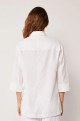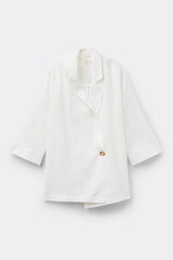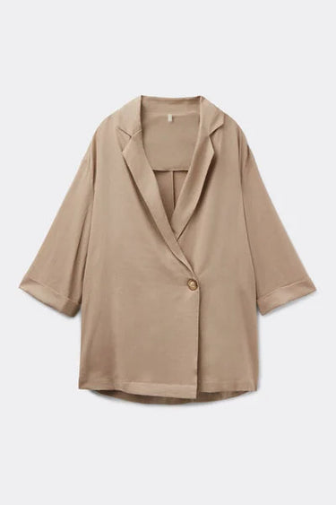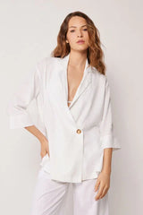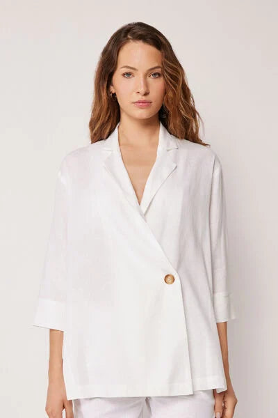 Looser fit blazer with a wide and fluid cut, made with linen and viscose for light and natural comfort. Fastened with a single button, it features 3/4 sleeves with cuffs and side slits that add movement and style. Versatile and refined, it is ideal to wear over light tops or summer outfits, perfect for creating a chic and elegant look both for evenings by the sea and in the office.