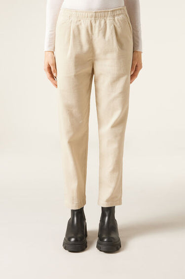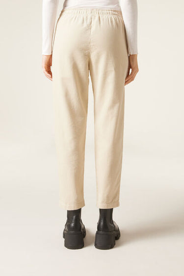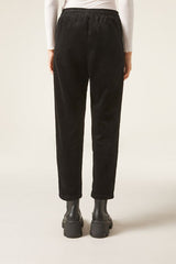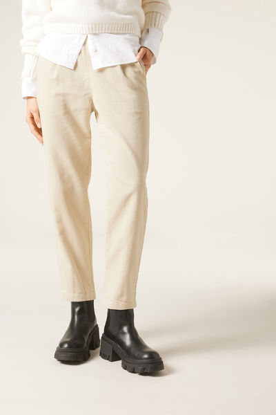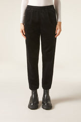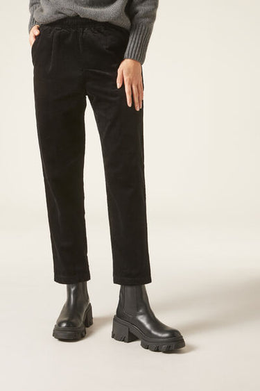 Women’s velvet trousers with darts and a slim comfort fit, slightly cropped length at the ankle, perfect for creating modern and sophisticated looks. The soft elastic waistband and adjustable internal drawstring allow for a tailored fit that can be adapted to your personal preferences. The front slant pockets add a touch of practicality and functionality to the velvet trousers.