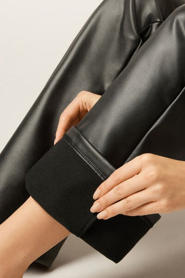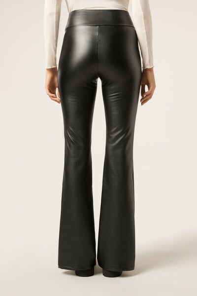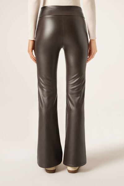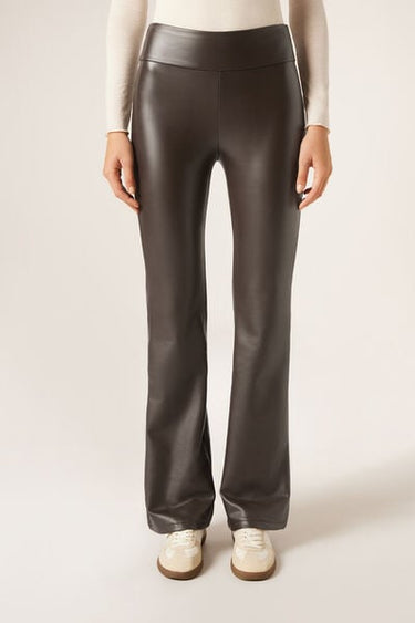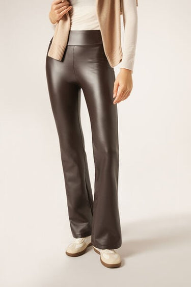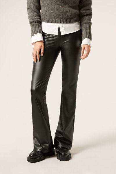 Thermal flared trousers with a coated effect, made from warm fabric with a brushed interior for maximum comfort on cold days. The high waistband envelops the waist without restriction, enhancing the silhouette with a modern and feminine touch.