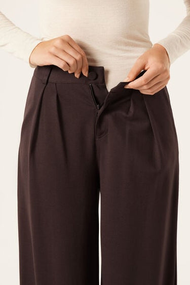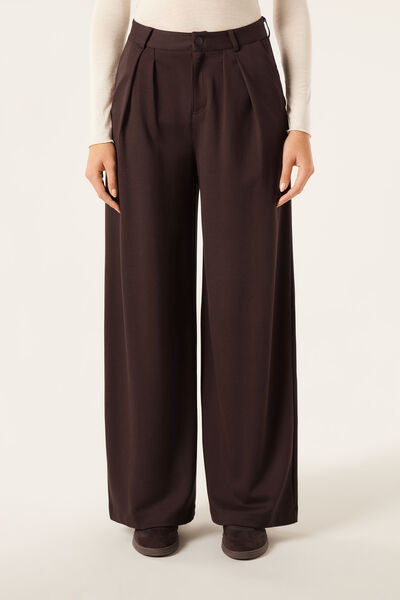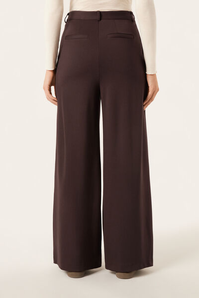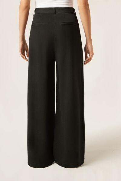 Palazzo trousers with zip, button and darts, in soft and comfortable Milano knit fabric. With practical side pockets and welt pockets at the back for a touch of elegance. The super-comfortable waistband with belt loops ensures a perfect fit for a sophisticated and refined look.