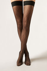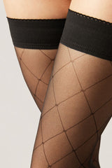 50 denier fishnet hold-ups with a diamond pattern, finished with a silicone frill. A balanced mix of graphic design and femininity.