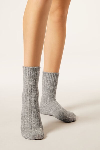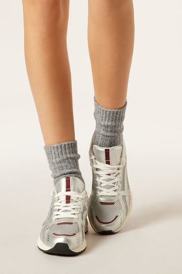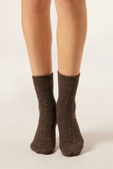 Women’s short socks with warm and thick wool, offering enveloping comfort. Embellished with micro sequins, their ribbed finish creates a sophisticated and shiny look, perfect for cold days.