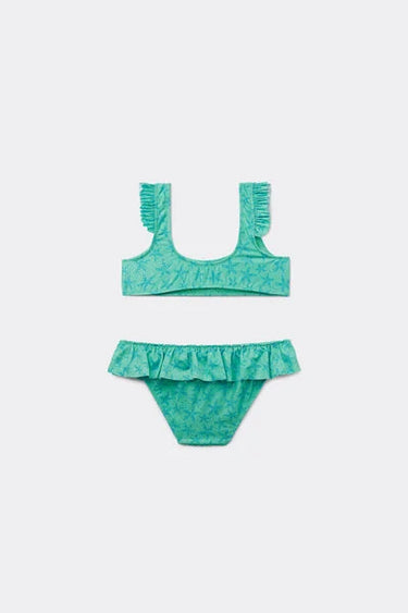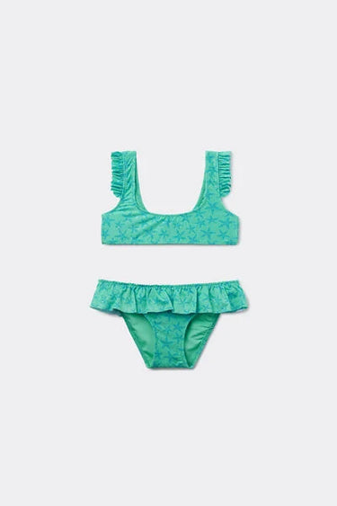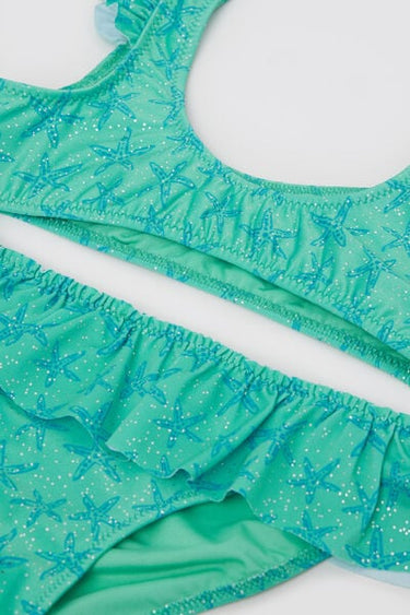 Girls’ bikini with a double-sided brassiere top with bottoms, in a light and soft fabric with a delicate glittery starfish pattern; ruffled shoulder straps and waist for a romantic touch. Fully lined for coverage and comfort. Closed back.
