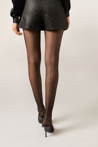 30 denier sheer tights with refined gold glitter back seam, which runs from the toe to the top. Soft waistband and cotton gusset for natural comfort.