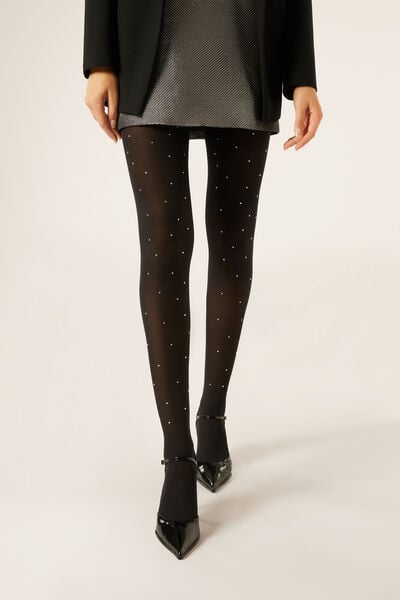 50 denier opaque tights embellished with all-over sparkling diamanté appliqué details. Soft waistband and cotton gusset for natural comfort.