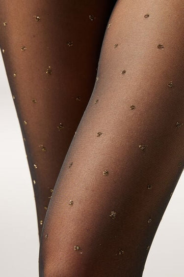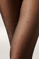 30 denier sheer tights with silver glitter polka dots and a gradient effect from ankle to thigh. Soft waistband and cotton gusset for natural comfort.