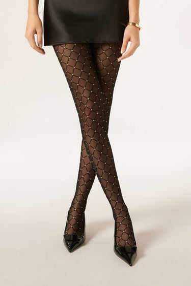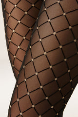 Tulle tights with a flocked diamond pattern and all-over glitter polka dots. The inside seam at the leg ensures a flawless fit, perfect for original and sparkly evening looks.
