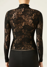 Fishnet lace top with floral pattern. With a crater neck and long sleeves, it is ideal for an elegant and sophisticated look under a jacket.