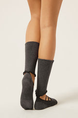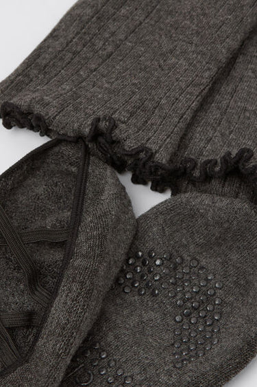 Non-slip Pilates socks for women in ballerina style, with an integrated leg warmer attached at the heel. Features crisscross straps over the instep and a grip sole for stability and safety during exercise.