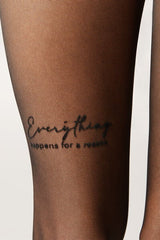 30 denier sheer tights with tone-on-tone flock print and positive vibes-themed lettering. Soft waistband and cotton gusset.