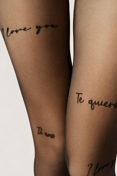 30 denier sheer tights with tone-on-tone flocked "I love you" print in multiple languages. Soft waistband and cotton gusset for natural comfort.