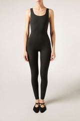 Jumpsuit made from super-opaque, compact and high-performance fabric, designed to shape and enhance the silhouette. The innovative double-zone internal adhesive, strategically positioned on the tummy and under the bust, provides an even more defined hourglass effect, supporting and slimming without compressing. This advanced technology offers targeted and stable support even during movement. Ideal for sports, it combines elegance, comfort and maximum freedom of movement.