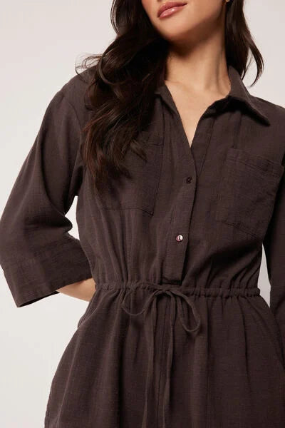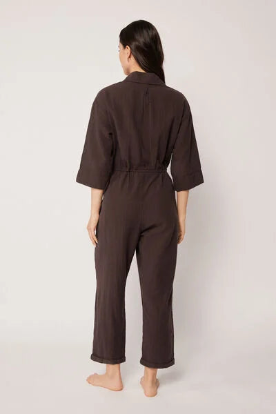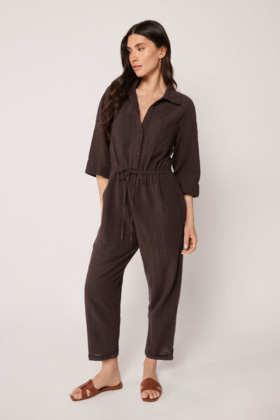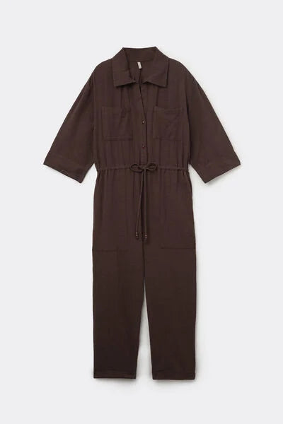 Jumpsuit with an easy-chic design, made from breathable cotton with a natural texture. The model features 3/4 sleeves, long trousers and a shirt collar. The drawstring waist allows you to adjust the fit and enhances the silhouette, while the large patch pockets on the chest add a practical and contemporary detail. Ideal for leisure time or to wear over a bikini.