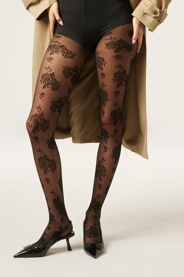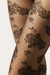 30 denier fishnet tights with a diamond pattern and delicate raised floral design. Soft waistband and cotton gusset for natural comfort.