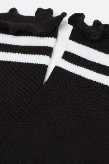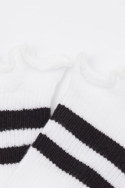 Women’s short socks in soft cotton. The micro-ribbed finish offers a touch of refinement and just the right amount of stretch. The romantic edge and contrasting colour bands add a discreet and feminine originality.