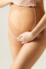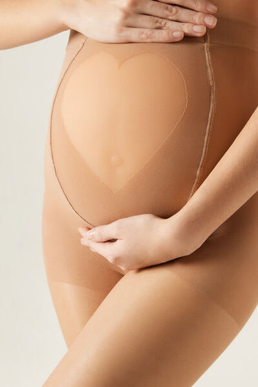 20 denier sheer maternity tights with anatomical front panel that adapts to the shape of the tummy as it grows. Reinforced body for extra support with romantic velour heart pattern. Cotton gusset and comfortable waistband.