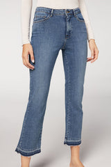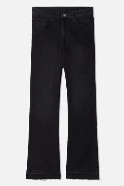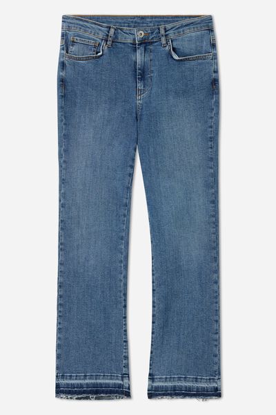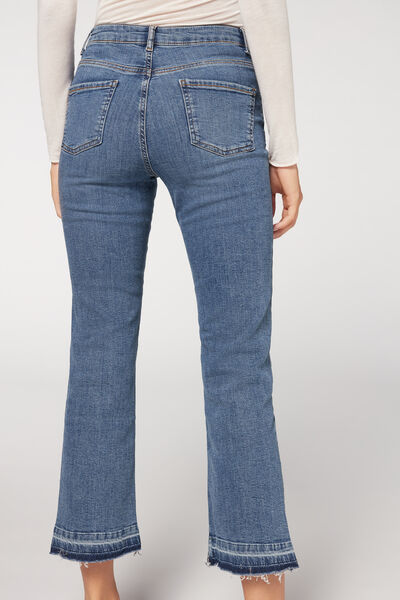 Cropped flared jeans with practical front and back pockets, and a zip with button fastening.