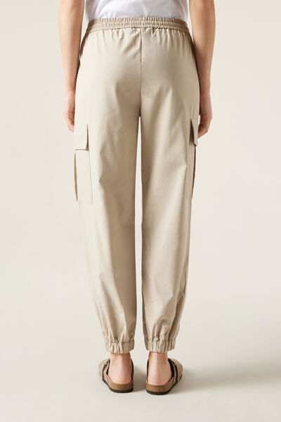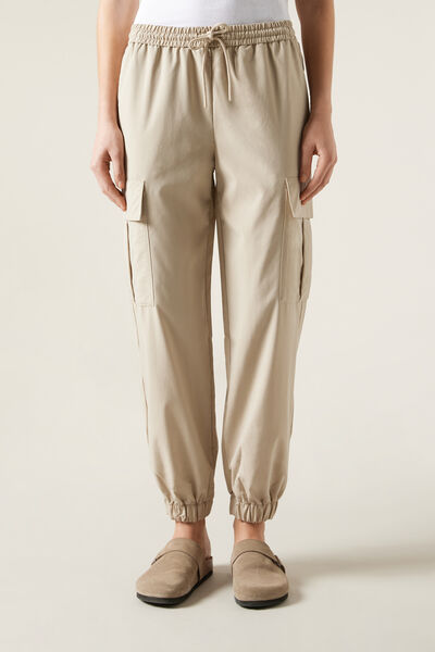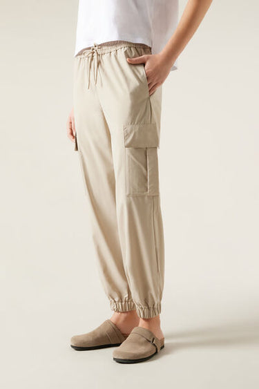 Cargo trousers in soft-touch modal, with convenient side pockets and trim on the bottom for a modern fit. The elasticated waistband with drawstring provides comfort and practicality, making them perfect for a casual and functional look.