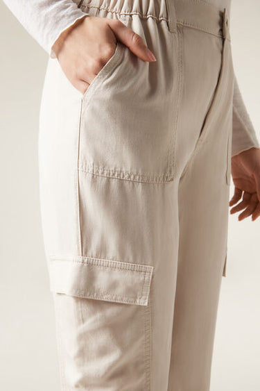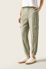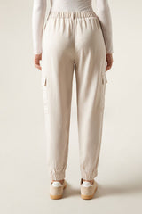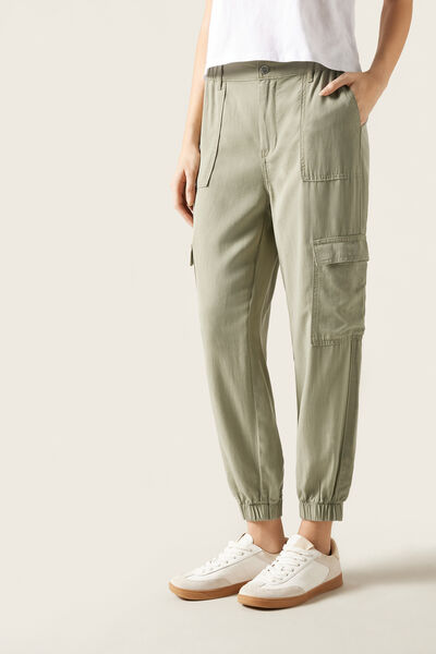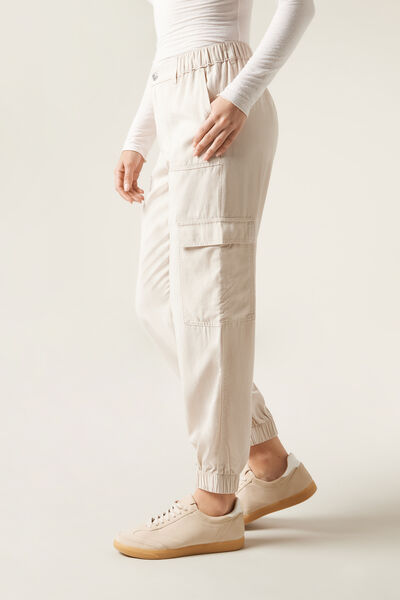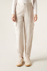 Cargo trousers with zip and button fastening, enhanced with belt loops. The elasticated waistband ensures optimal comfort, perfectly adapting to the silhouette. Made from an ultra-lightweight fabric that is soft to the touch, they combine elegance and practicality for a sophisticated yet relaxed look. The comfortable fit and practical design make these trousers ideal for any occasion, from leisure time to daily commitments, with a touch of natural and effortless style.