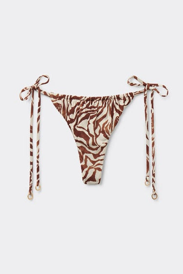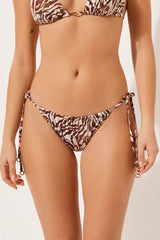 Thong bikini bottoms with thin, adjustable ties at the hips. Thanks to the slightly rounded front waist, they can be worn with a regular fit or with a higher leg at the hips to enhance your figure. The style features a sophisticated Brown Zebra pattern. Fully lined with invisible seams.