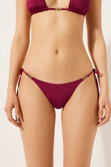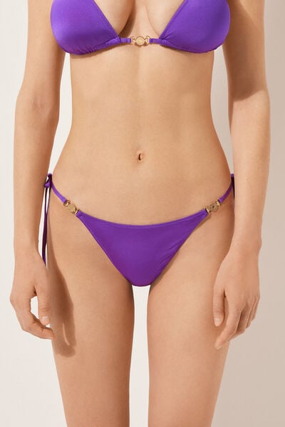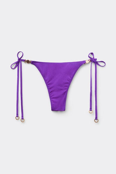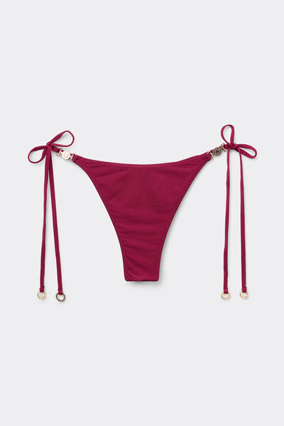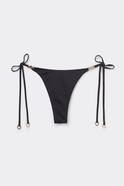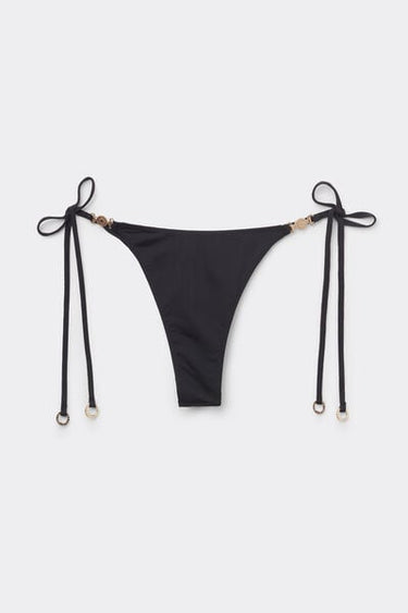 Thong bikini bottoms with thin tie fastening at the hips to adjust the fit. Featuring a minimal fit that enhances the silhouette with a sensual and sophisticated touch. The slightly rounded waist at the front allows for wear with classic coverage or a higher leg, depending on your body shape. The shiny satin-effect fabric, embellished with elegant gold-tone details, evokes a sophisticated sense of discreet luxury. Fully lined with invisible seams.
