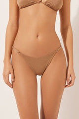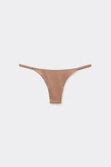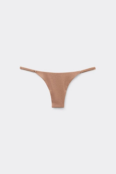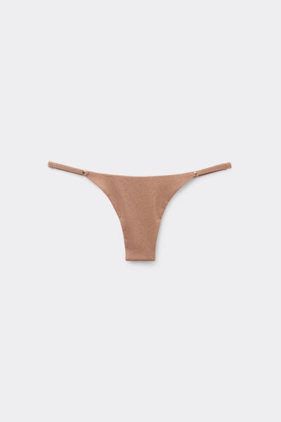 Thong bikini bottoms with thin, adjustable ties at the hips. Thanks to the slightly rounded front waist, they can be worn with a regular fit or with a higher leg at the hips to enhance your figure. The style features soft fabric embellished with shiny lamé thread. Fully lined with invisible seams.