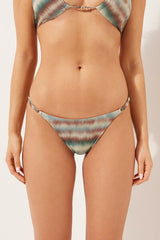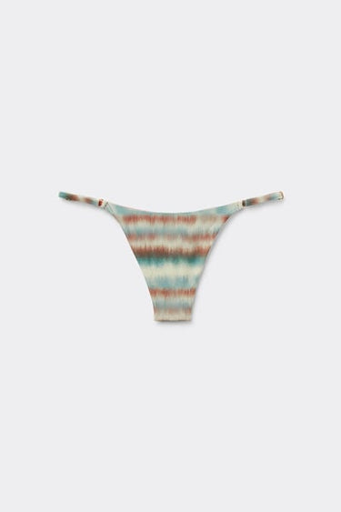 Thong bikini bottoms with adjustable side straps. The slightly rounded waist at the front allows for wear with classic coverage or a higher leg, depending on your body shape. Bright, dégradé tie-dye pattern embellished with glittery details on a soft and shiny fabric, ideal for a vibrant, original look. Fully lined with invisible seams.