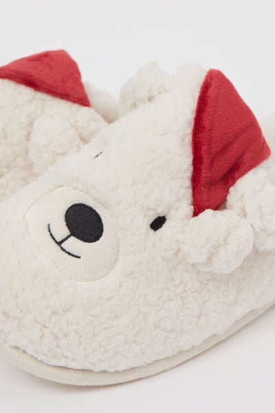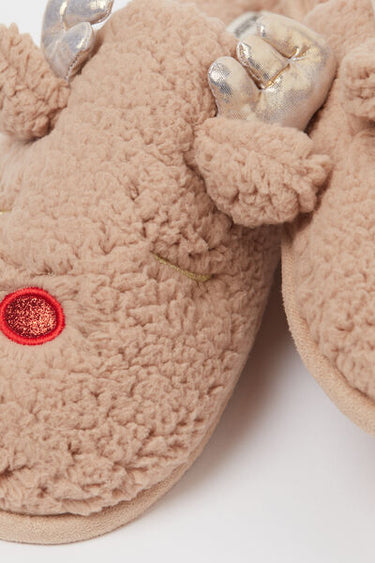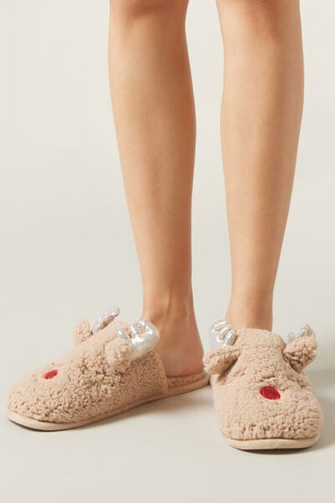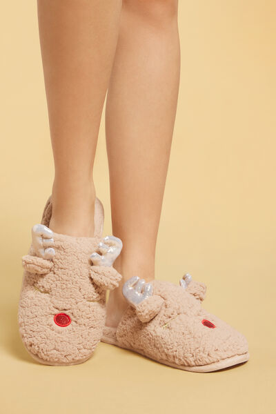 Women’s Christmas-themed slippers in soft teddy fabric in the shape of an animal, offering snuggly comfort thanks to the softness of the material. The rubber sole with a slip-resistant surface provides stability, while the festive decorations add a playful, Christmassy touch.