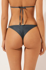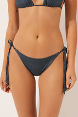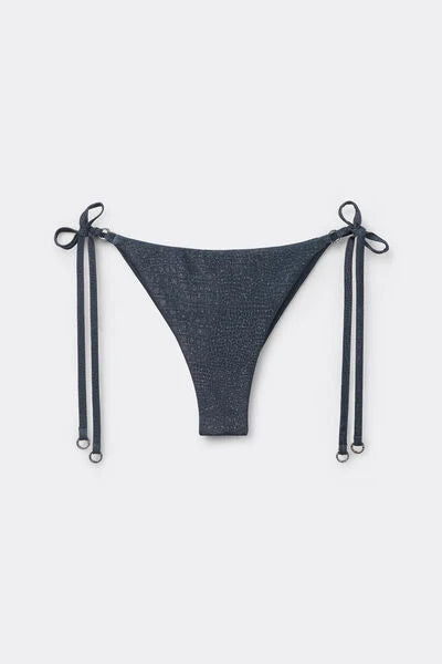 Brazilian bikini bottoms with adjustable side ties for a perfect fit. Made of soft, slightly glittery fabric, embellished with a refined tone-on-tone snake print. The slightly rounded waist at the front allows for wear with classic coverage or a higher leg, depending on your body shape.