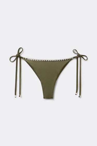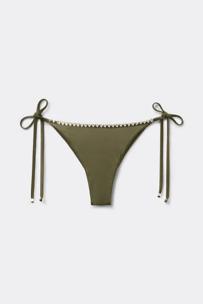 Brazilian bikini bottoms with adjustable tie sides for a perfect fit. Made from shiny microfibre with refined embroidery on the edges, it combines style and elegance. The slightly rounded waist at the front allows for wear with classic coverage or a higher leg, depending on your body shape.