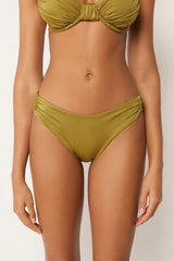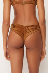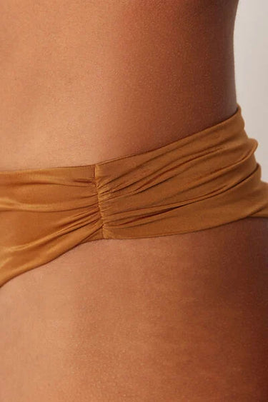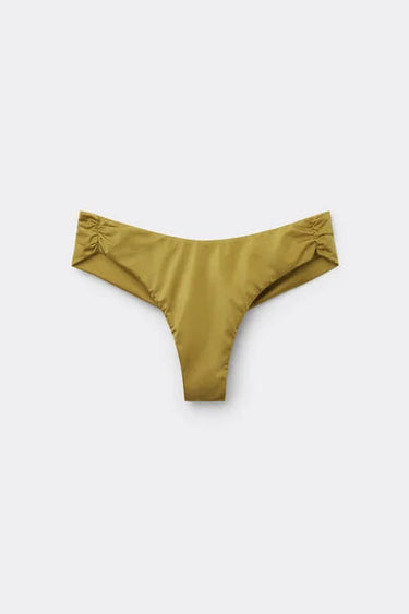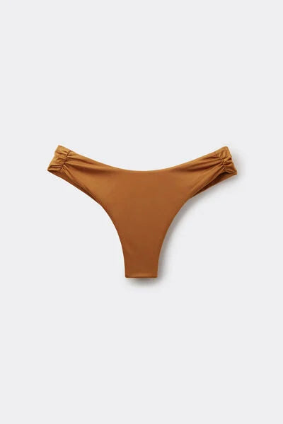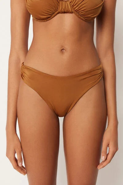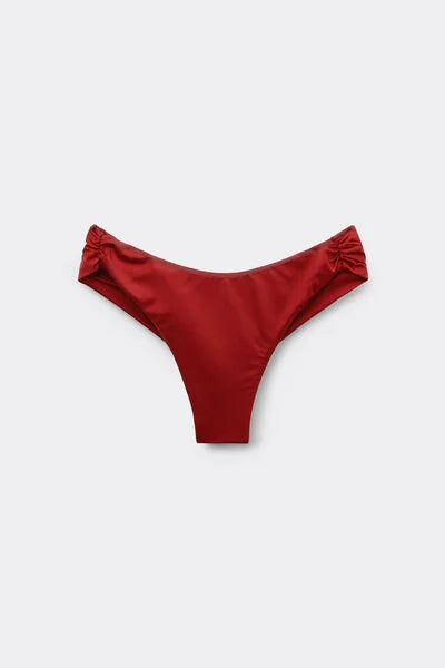 Brazilian bikini bottoms with full lining and rear ruching. The shiny satin-effect fabric feels particularly soft. The slightly curved front waistband allows you to wear it either in a classic low-cut style or more high-leg, depending on your body.