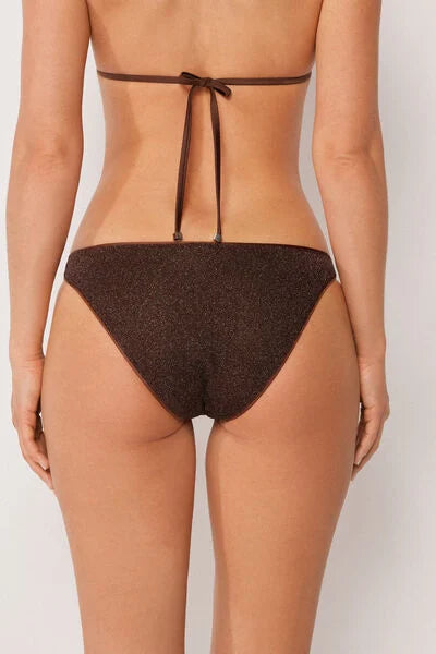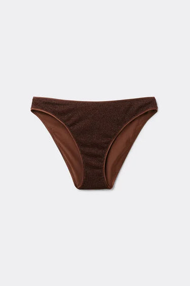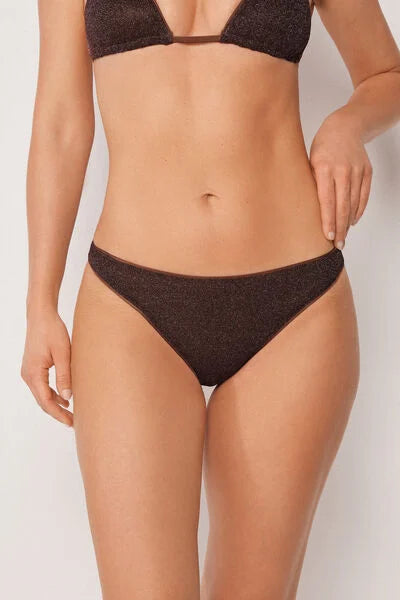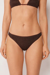 Fully lined bikini bottoms with invisible seams. Made from refined shiny lamé fabric offering a bright and sophisticated effect. The slightly rounded waist at the front allows them to be worn with classic coverage or a higher leg, depending on your body shape.