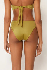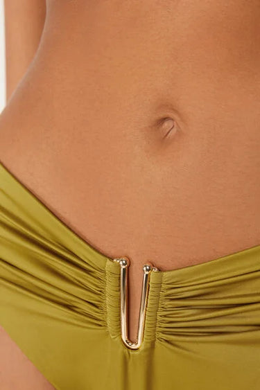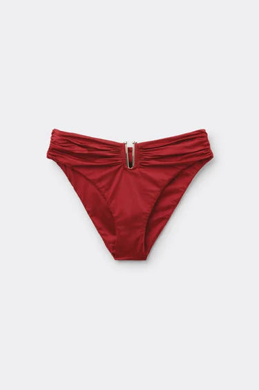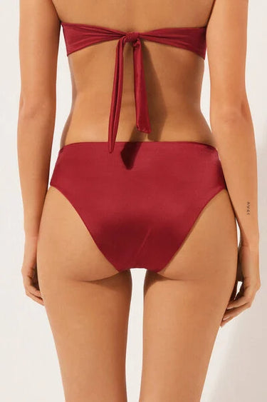 High-waisted bikini bottoms featuring a shiny satin-effect fabric, embellished with an elegant gold-tone accessory. The slightly rounded waist at the front allows for wear with classic coverage or a higher leg, depending on your body shape.