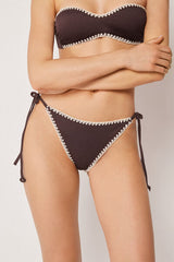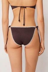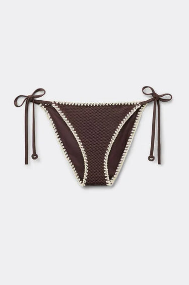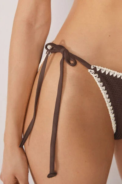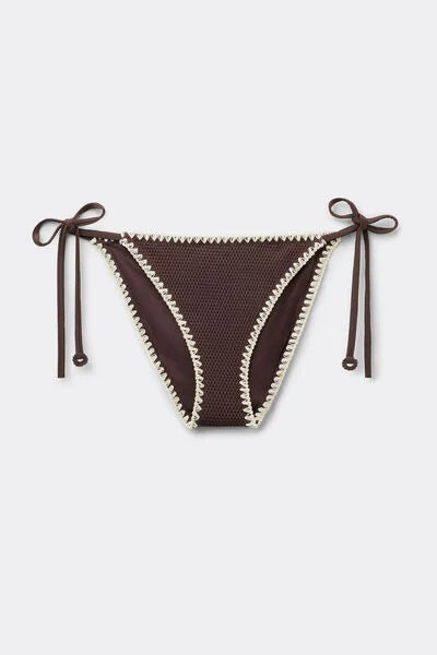 Bikini bottoms with tie fastening at the hips to adjust the fit. Slightly raised soft fabric with elegant contrasting embroidery. The slightly rounded waist at the front allows them to be worn with classic coverage or a higher leg, depending on your body shape. Fully lined with invisible seams.