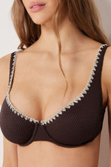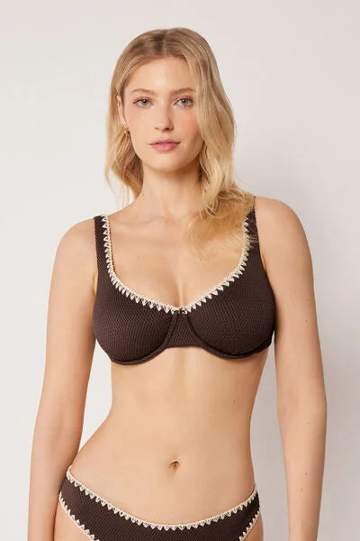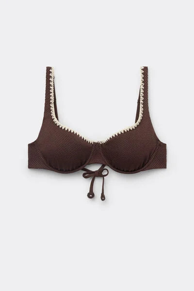 Balconette bikini top with no padding, high bridge and underwire to provide optimal support, suitable for all sizes. Soft, slightly raised fabric, embellished with contrasting embroidery on the edges that enhances the design with character and distinctive elegance. Adjustable shoulder straps and thin tie fastening at the back.