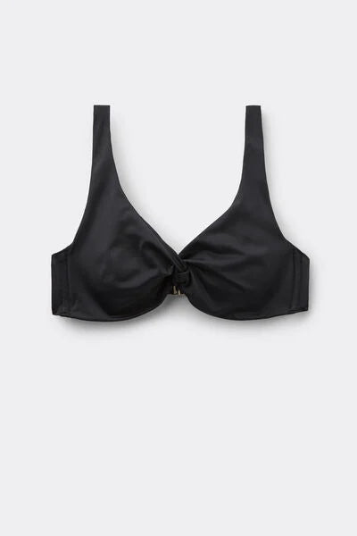 Non-padded balconette bikini top with underwire, designed to enhance and support even the larger bust. The special construction of the cups, combined with the side boning, ensures stability and hold. The interior is finished in tulle to reinforce the support, while the fabric, with a pleasant feel and compact structure, ensures comfort and support. The adjustable and removable shoulder straps can be crossed over at the back, perfectly adapting to different needs. The back fastening with clasp and double adjusters allows for a personalised fit.