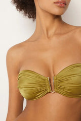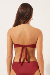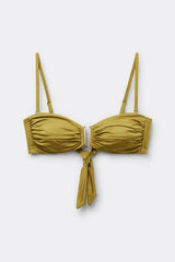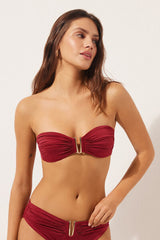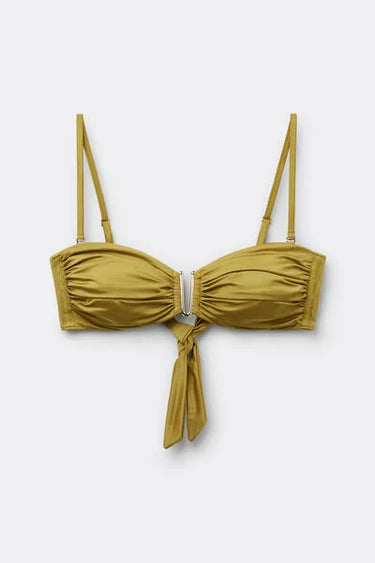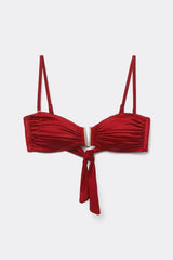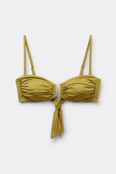 Bandeau-style bikini top with lightly padded cups. Made of a shiny satin-effect fabric that feels particularly soft, with an elegant accessory at the center of the bust. Side boning provides good support. Back closure with a bow.