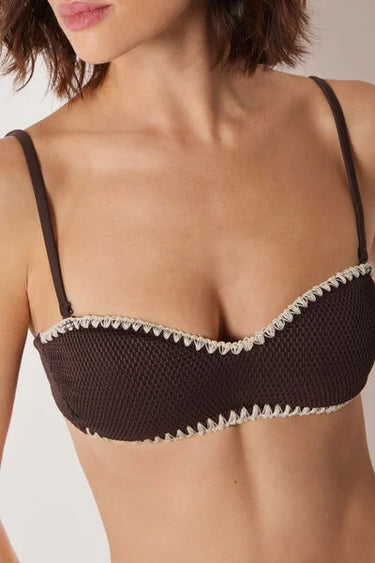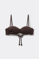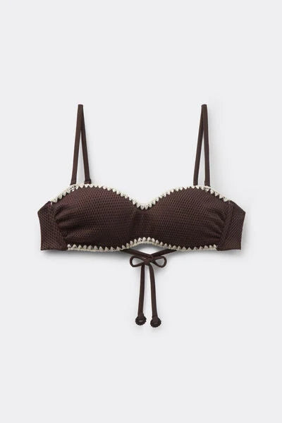 Low-cut bandeau bikini top with lightly padded cups. The side boning provides good support. Soft, slightly raised fabric, embellished with contrasting embroidery on the edges that enhances the design with character and distinctive elegance. Removable shoulder straps and back bow fastening.