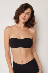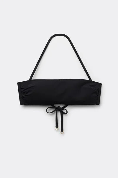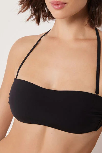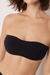 Bandeau bikini top with lightly padded cups and no underwire for natural comfort. The super-soft fabric is pleasant to wear and light and comfortable on the skin. Adjustable shoulder straps and side boning provide good support. Back bow fastening.