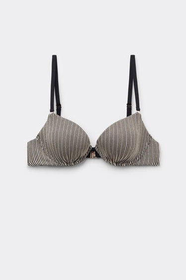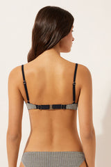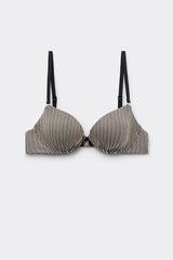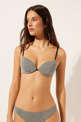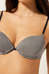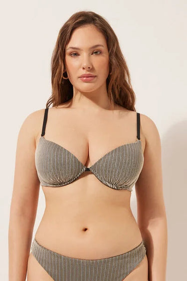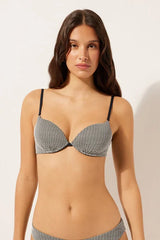 Push-up bikini top with lightly padded cups and underwire for support and volume. The style features a gold-based striped pattern that add a bright and sophisticated touch. Fixed shoulder straps. Back clasp fastening with double adjusters.