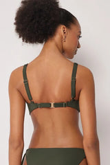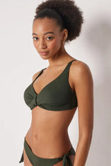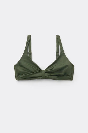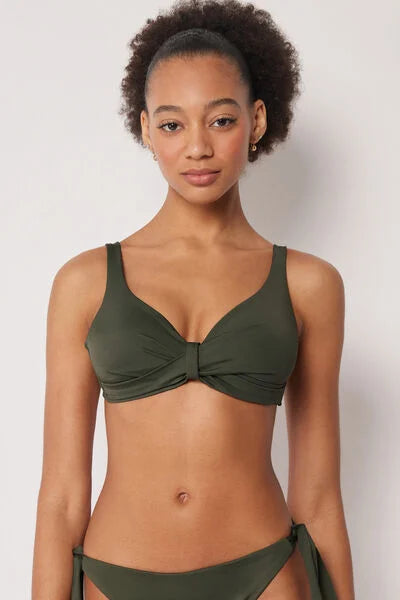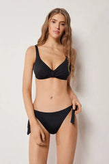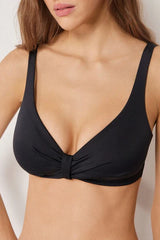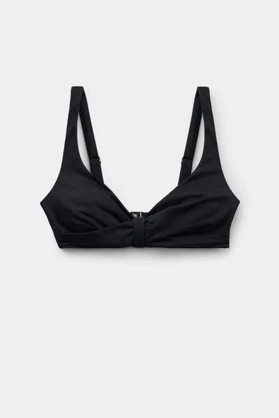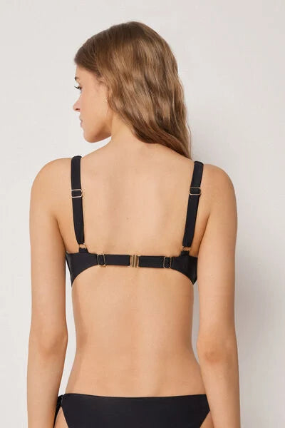 Non-padded and non-wired triangle bikini top, designed to enhance and support even the larger cleavage, with a removable central tie that allows you to adjust the neckline for a personalised fit. The special construction of the cups, combined with the side boning, ensures stability and good hold. The interior is finished in soft tulle for increased support, while the fabric, with a soft feel and compact structure, ensures comfort and hold. The adjustable shoulder straps allow for optimal adjustment, while the back fastening with clasp and double adjusters offers a personalised fit.