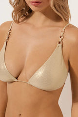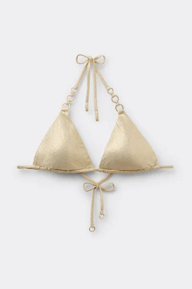 Slide triangle bikini top with removable padding and no underwire for a natural effect. Made from a soft, shiny fabric, embellished with a refined tone-on-tone chevron pattern. The shoulder straps have eyelets on the ends so they can be hooked onto the back band or tied around the neck. Thin tie fastening at the back.
