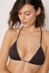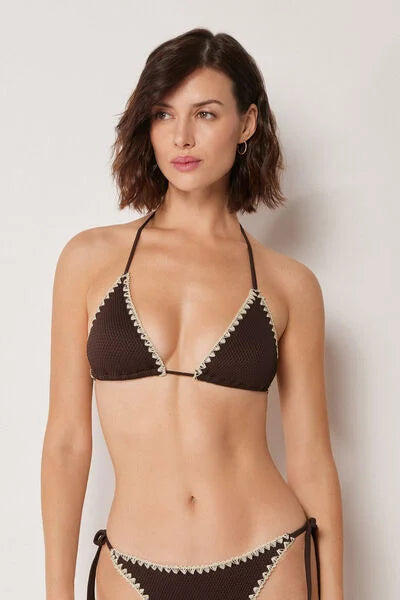 Non-wired triangle bikini top with removable padding. Soft, slightly raised fabric, embellished with contrasting embroidery on the edges that enhances the design with character and distinctive elegance. The shoulder straps have eyelets on the ends so they can be hooked onto the back band or tied around the neck. Thin tie fastening at the back.
