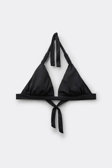 Non-wired triangle bikini top with removable padding. The shoulder straps with a sliding knot allow you to adjust the capacity of the cup. The fabric, with a soft feel and compact structure, ensures comfort and support. The shoulder straps have eyelets on the ends so they can be hooked onto the back band or tied around the neck. Adjustable back bow fastening.